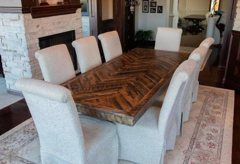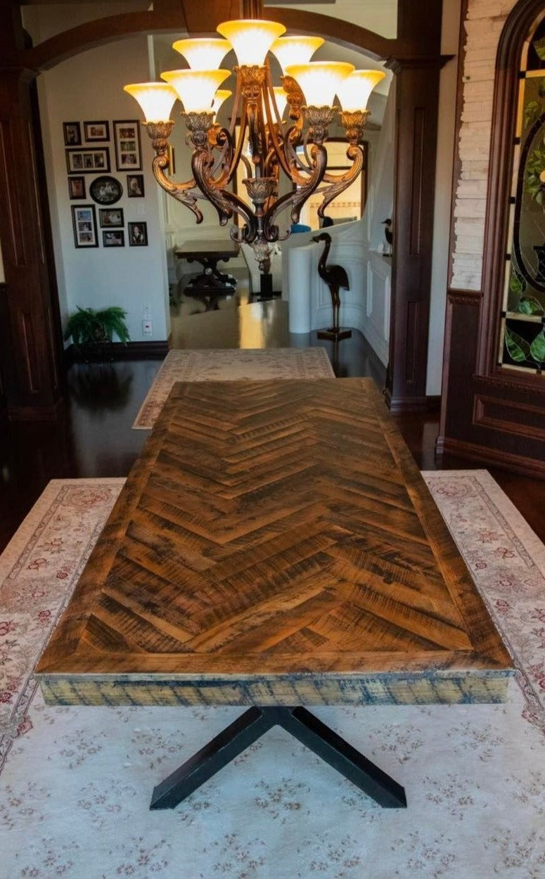 Ce modèle est conçu à partir de planche issue de bois de grange centenaire. Chacune des nombreuses pièces qui composent la chevronnée sont embouffetées soigneusement par nos artisans passionnés afin d’assurer une durée de vie inégalable. Pour combler toutes vos attentes, elle est accompagnée d’un vaste choix de pattes en acier robuste.