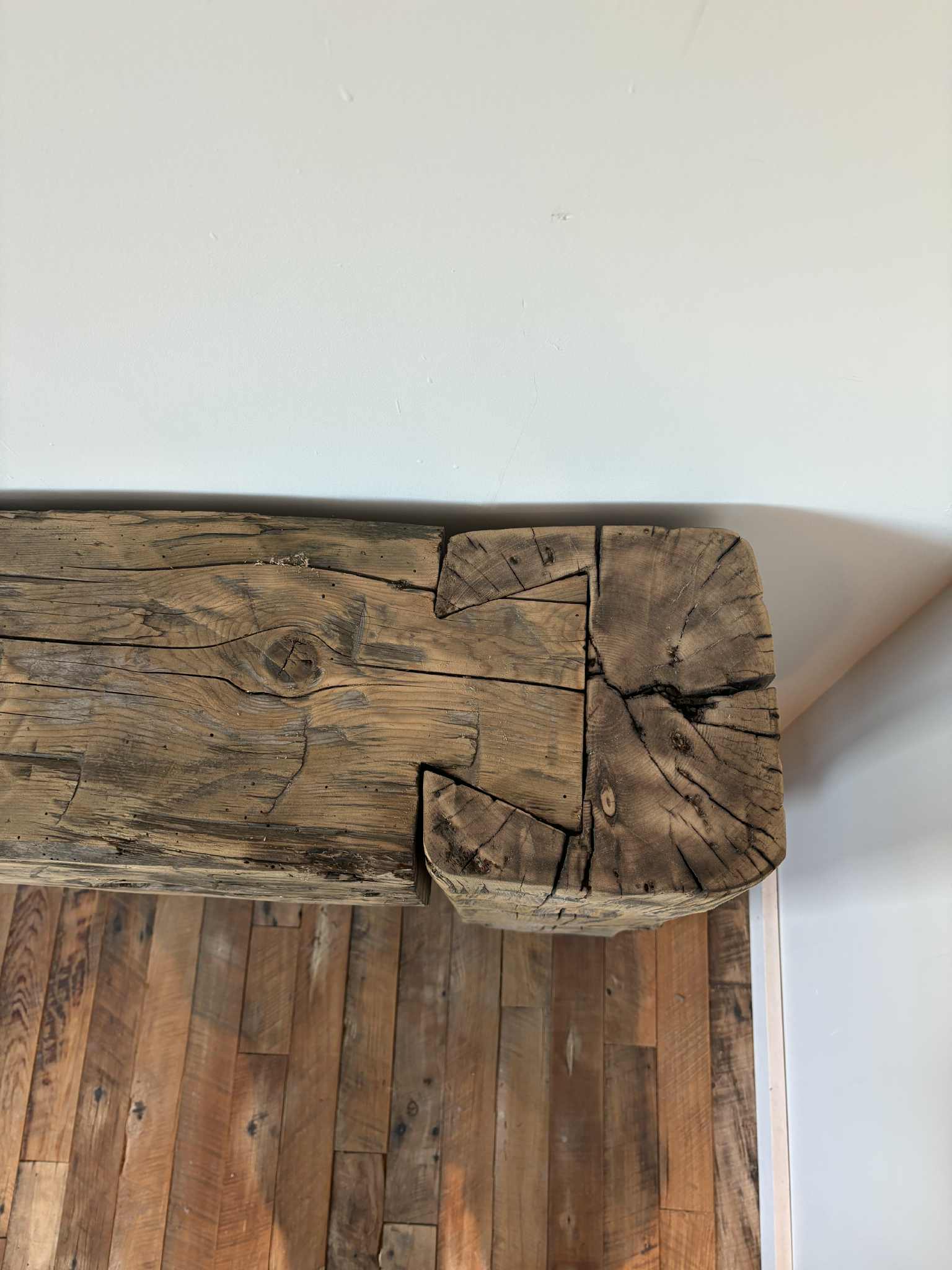 Ce meuble d’entrée unique est entièrement fabriqué à la main à partir de poutres anciennes équarries à la hache, issues de vieilles structures patrimoniales du Québec. Ces poutres, façonnées il y a plus d’un siècle par des artisans d’autrefois, portaient jadis la charpente de maisons et granges centenaires.